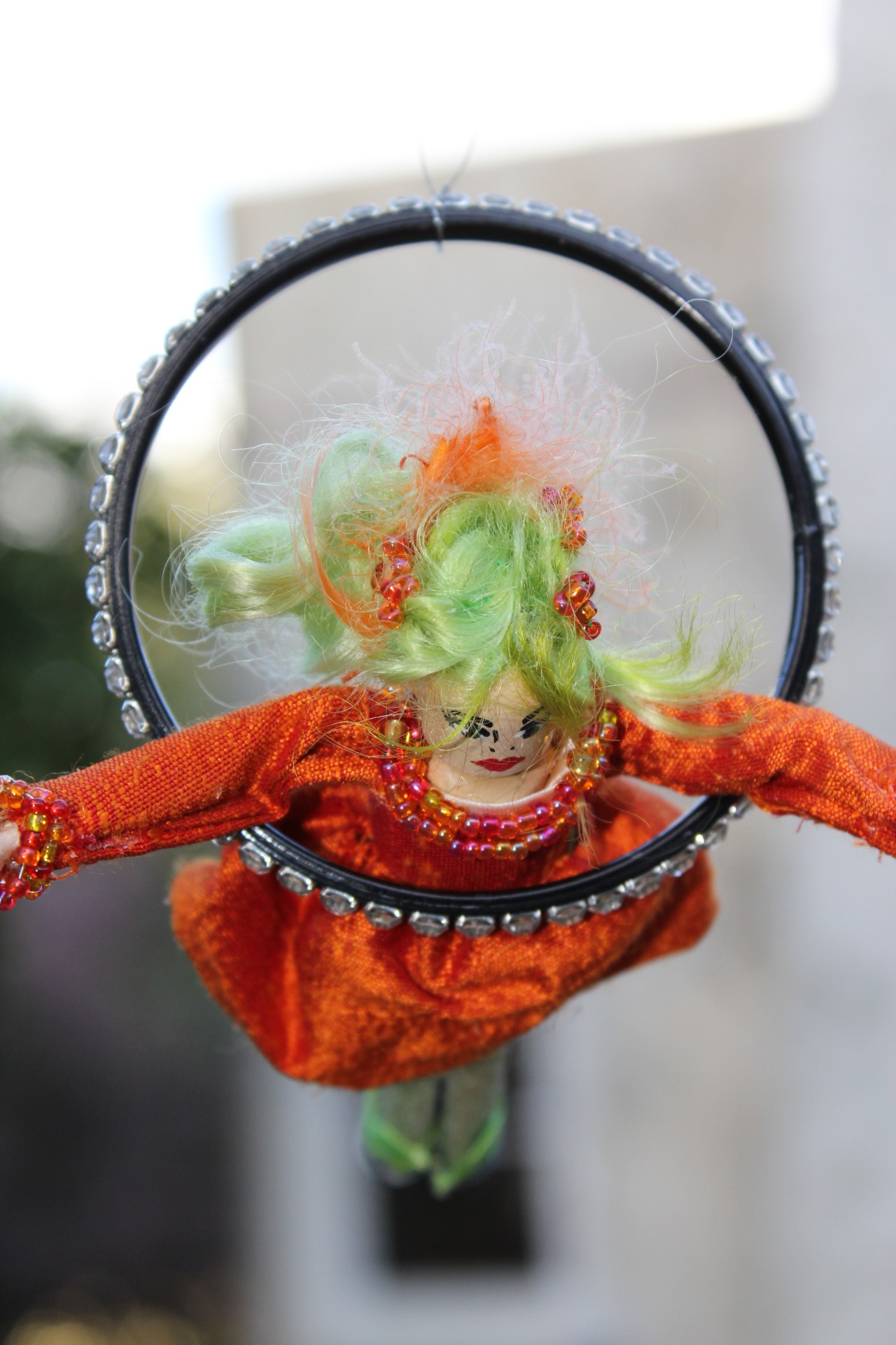 Arabella and her brother Angus are a high-wire duo swinging from the top of the circus tent. Arabella is dressed in orange silk and adorned with beads and feathers. She hangs through a hoop which can be suspended from a hook or even a branch on a Christmas tree