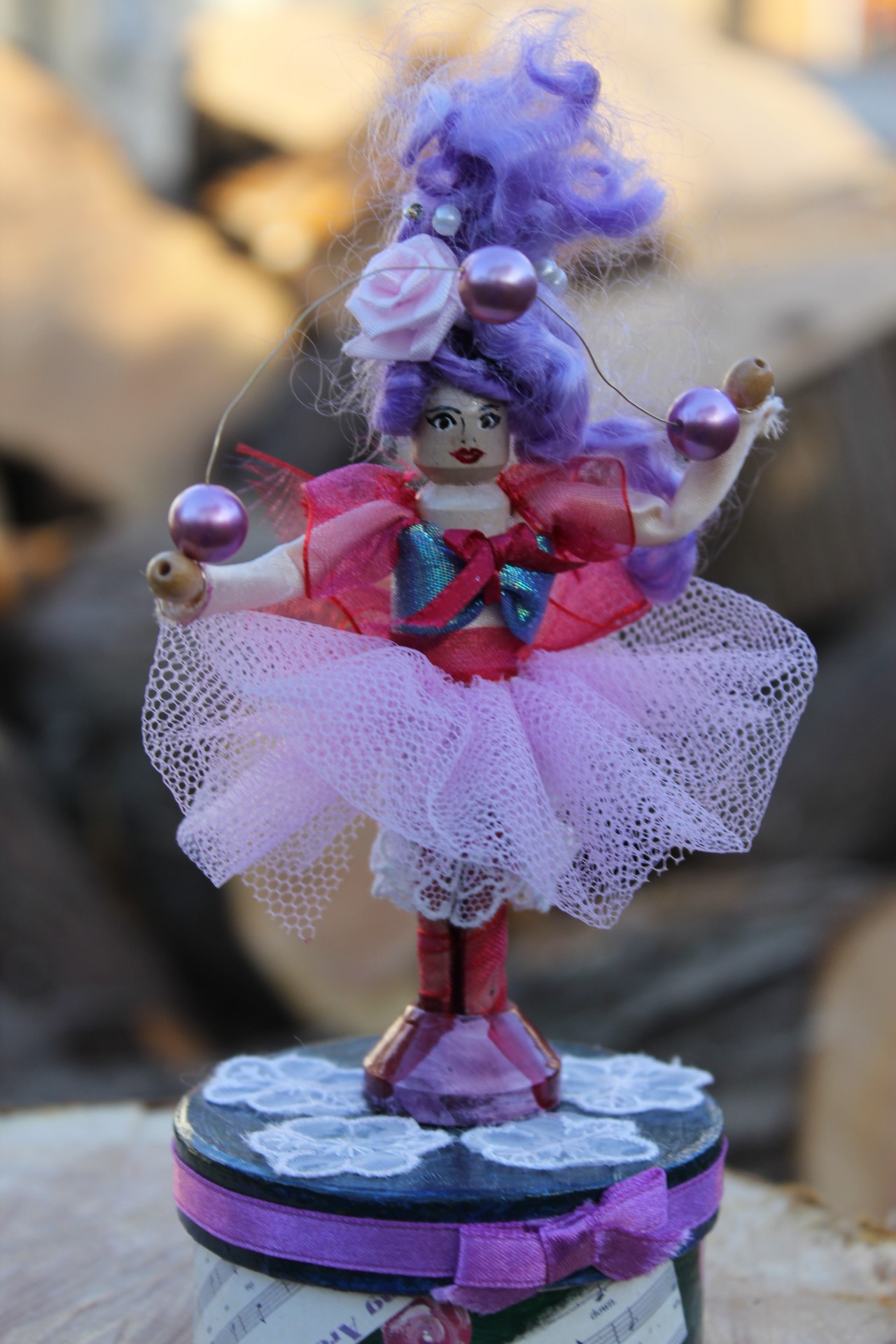 "Dolores" is multi-talented, being able to dance and juggle at the same time! Her wild coiffured hair is adorned with pearls and roses. She stands atop a music-themes box which can be used to store your little keepsakes.