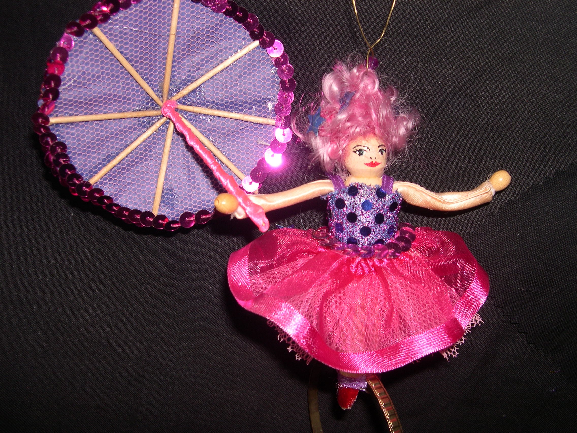 Felicity is the acrobat who bravely balances on a hoop carrying an umbrella. The umbrella is constructed from tissue paper and wooden sticks. She is dressed in tulle and sequins. She has a wire hoop at the top of her head so can be hung to display.